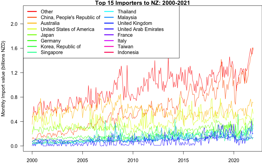 title(main='Top 15 Importers to NZ: 2000-2021',